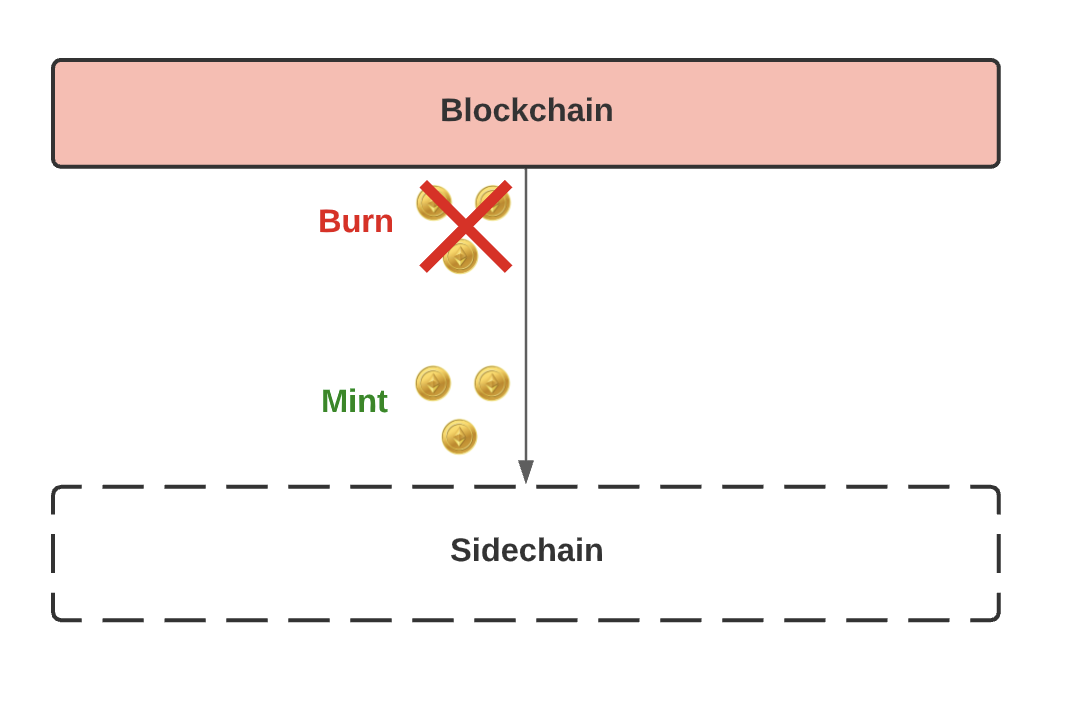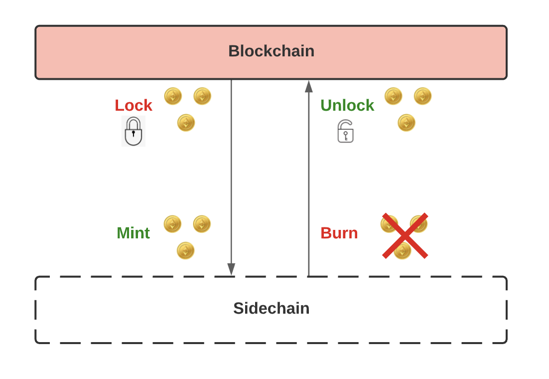 عندما نقوم بربط سلسلة بأخرى، فهذا يعني أنه يمكننا نقل الأصول بين هذين السلاسل. عندما يكون الربط أحادي الاتجاه فهذا يعني أنه هو المكان الذي ننقل فيه الأصول من السلسلة الرئيسية إلى السلسلة الجانبية، ولكن ليس العكس. يعمل هذا على حرق (burn) الرموز المميزة الموجودة على السلسلة الرئيسية عن طريق إرسالها إلى عنوان غير قابل للإنفاق - ثم صك (mint) الرموز المميزة على السلسلة الجانبية.