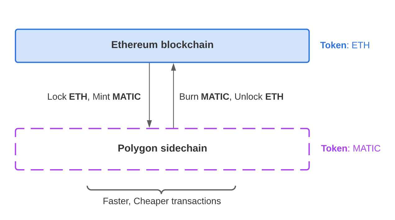 عندما يريد المستخدمون معاملات أسرع، يمكنهم قفل بعض ETH وإنشاء كمية مكافئة من رمز MATIC على سلسلة Polygon الجانبية. ومن ثم يمكنهم الإستمتاع بمعاملات أسرع وأرخص. بعد الإنتهاء من المعاملات، يمكنهم تحويل رمز MATIC الخاص بهم مرة أخرى إلى ETH.