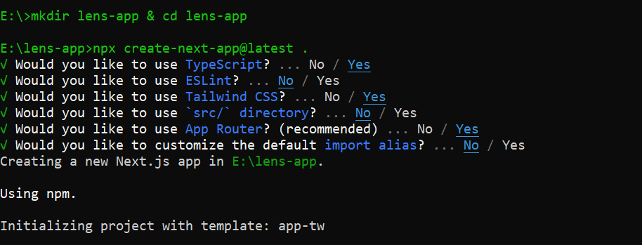 mkdir lens-app && cd lens-app npx create-next-app@latest .