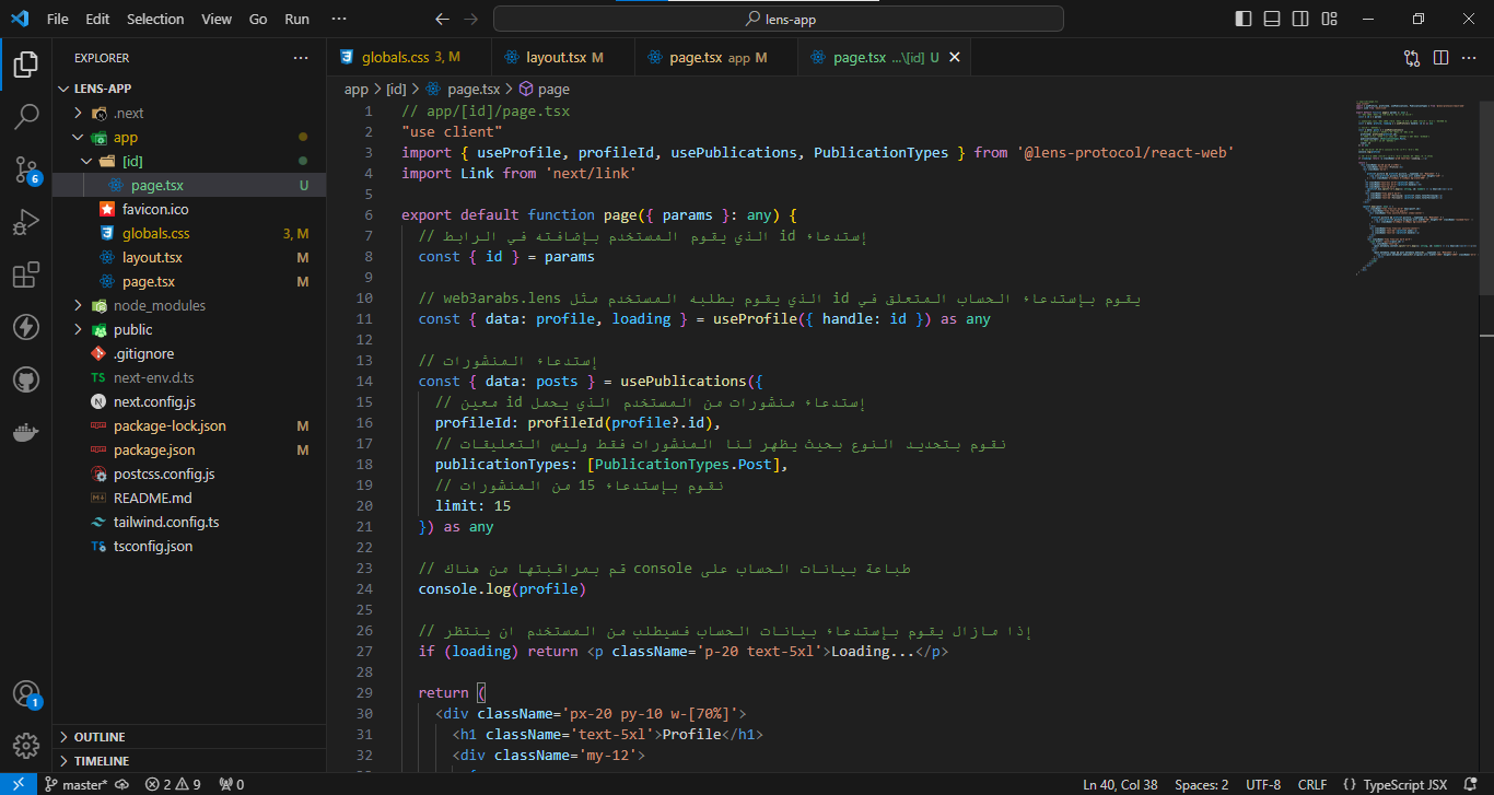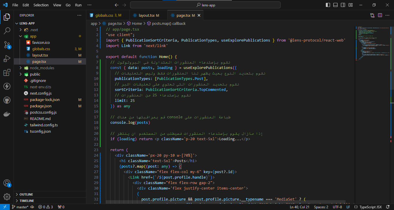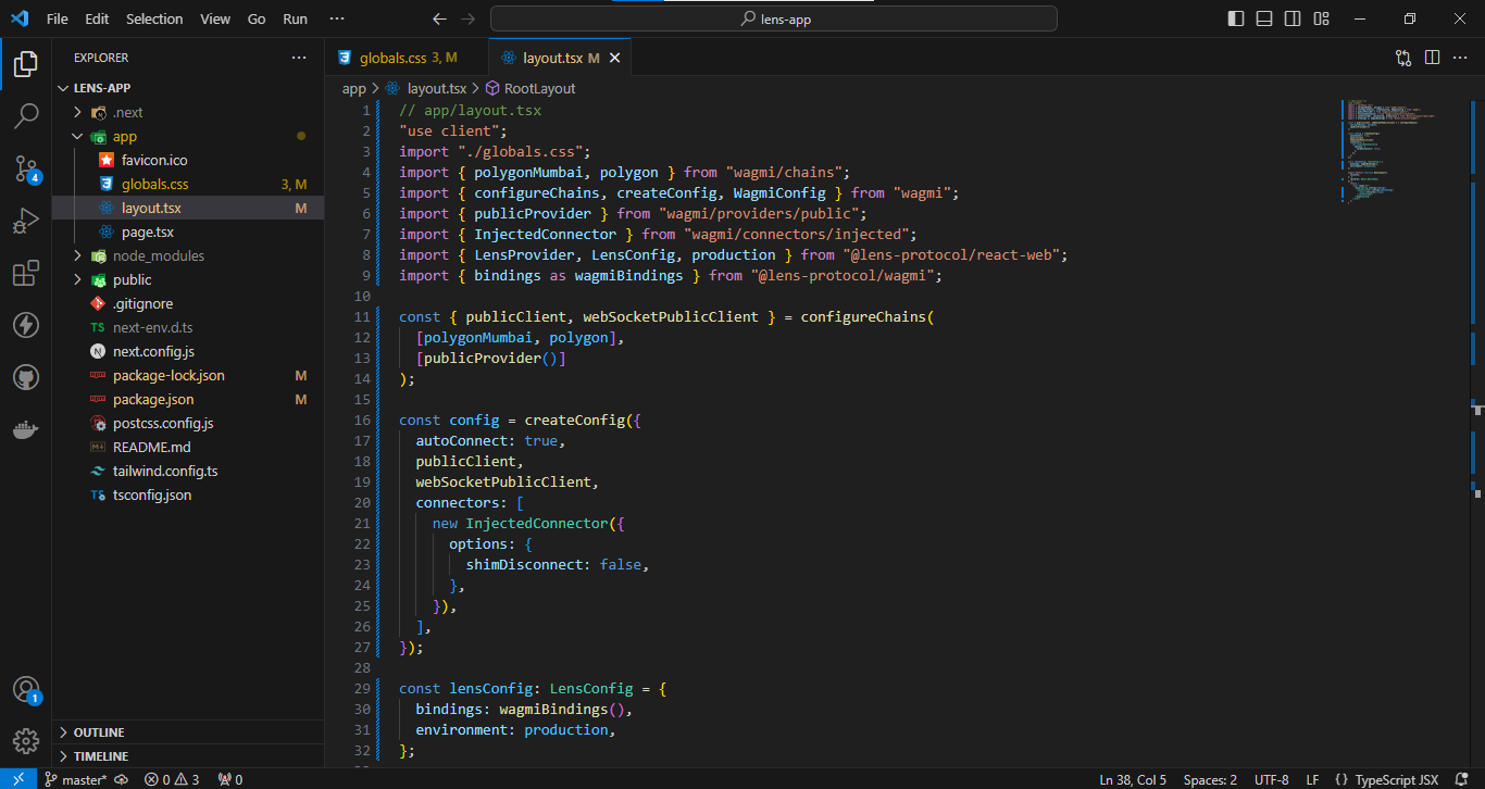 سنقوم الان بإعداد بروتوكول Lens في المشروع بحيث نستطيع التعامل مع مكونات البروتوكول بكل سهولة - ستذهب الى مجلد app وستقوم بإضافة هذه الأكواد في ملف layout.tsx