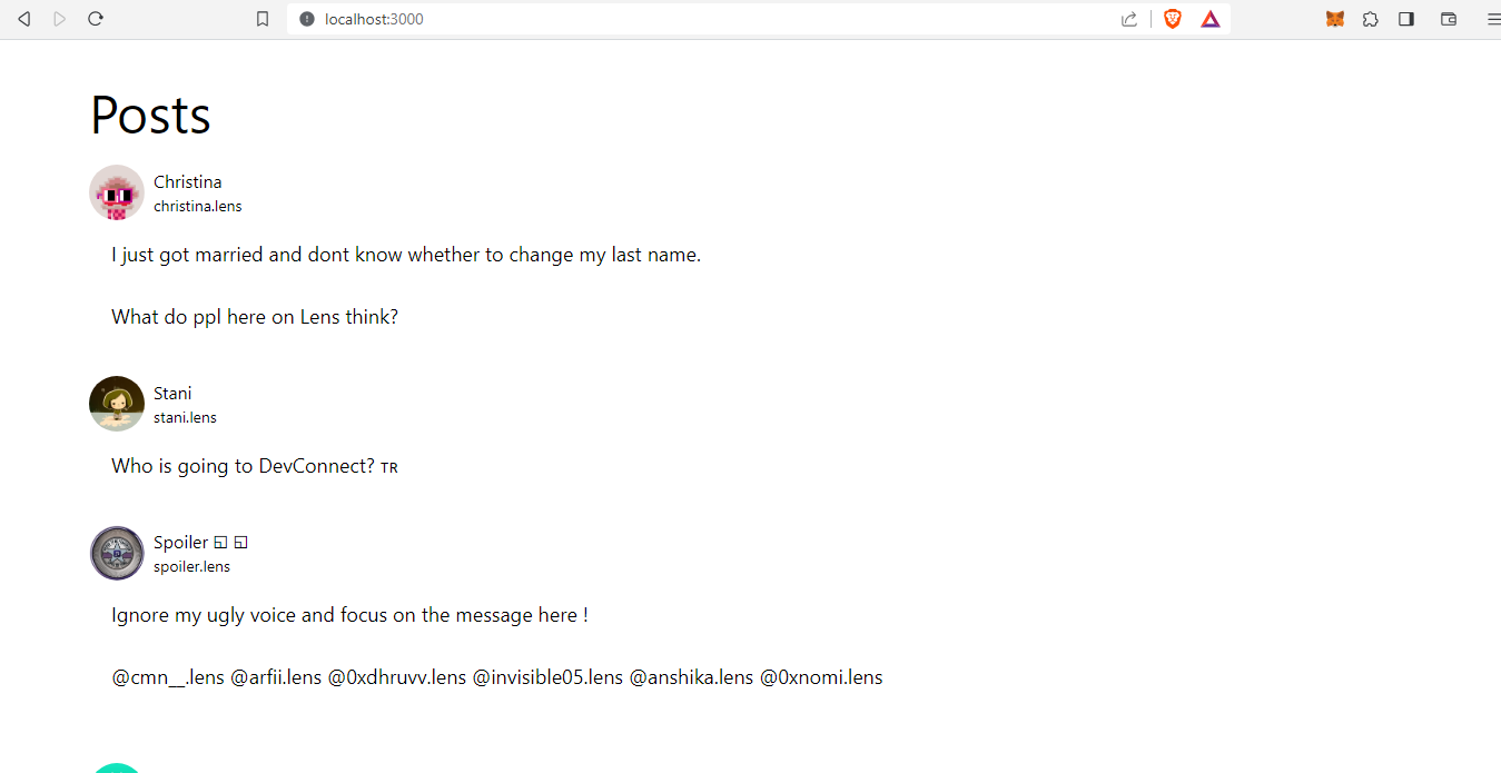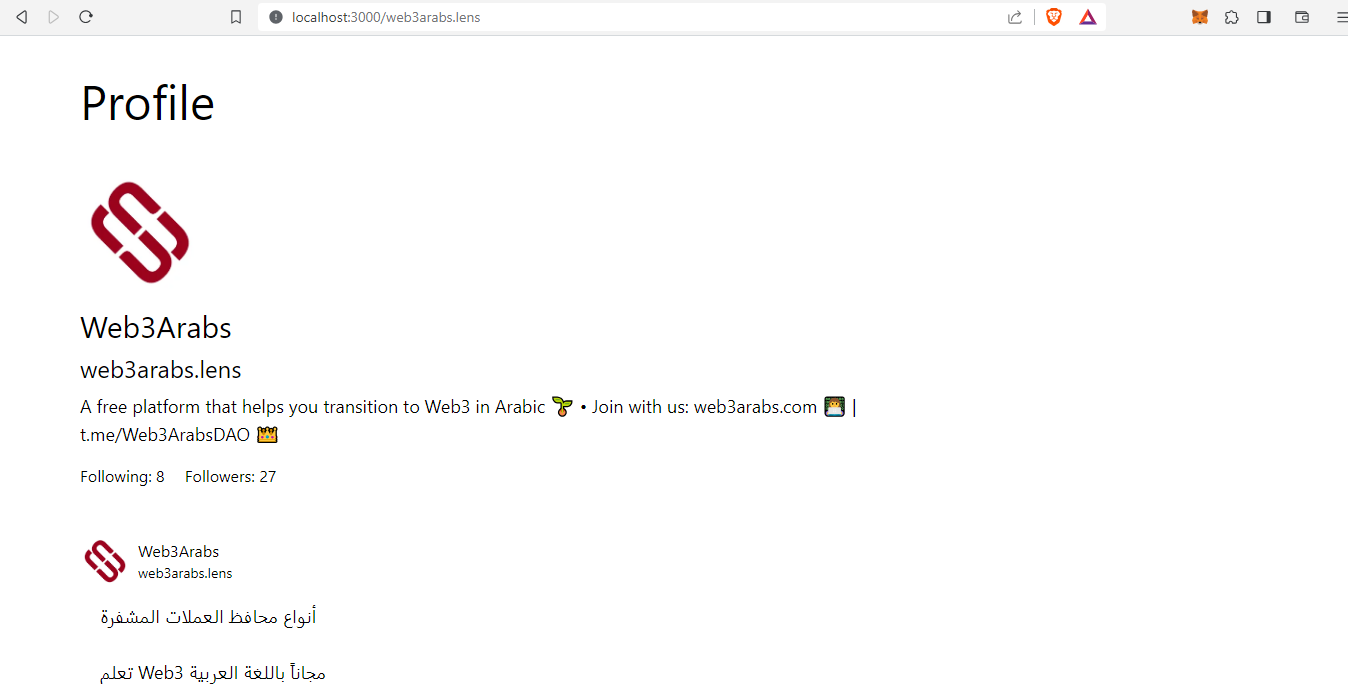 عند فتح حساب Web3Arabs على المشروع - localhost:3000/web3arabs.lens - يجب ان تكون بهذا الشكل: