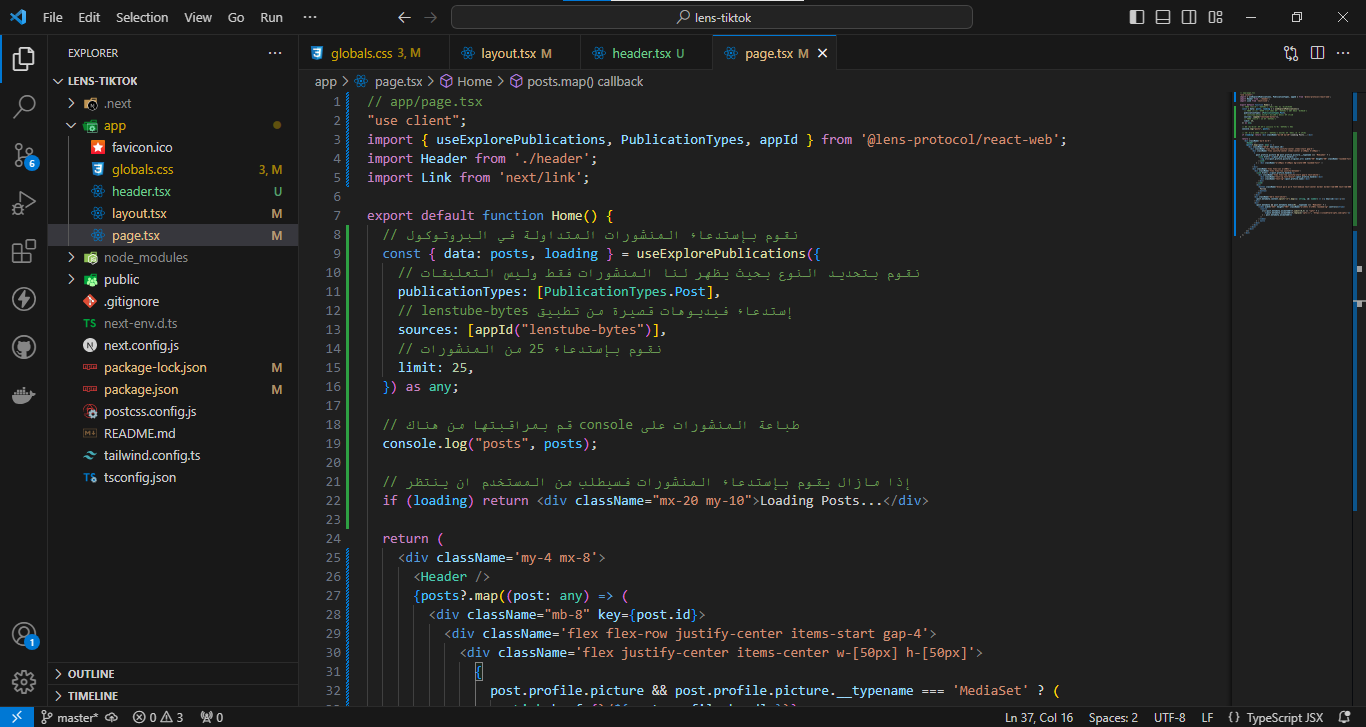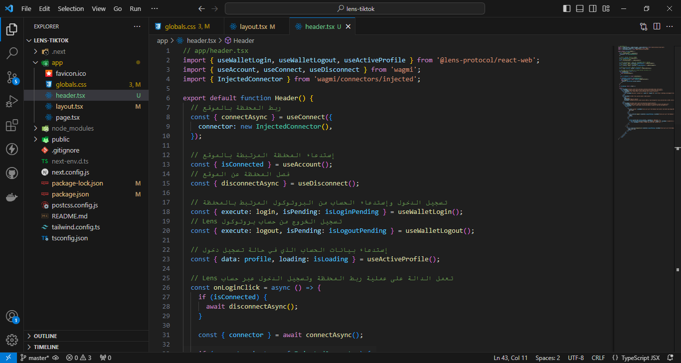 سنقوم الان بإعداد بروتوكول Lens في المشروع بحيث نستطيع التعامل مع مكونات البروتوكول بكل سهولة - ستذهب الى مجلد app وستقوم بإضافة هذه الأكواد في ملف layout.tsx