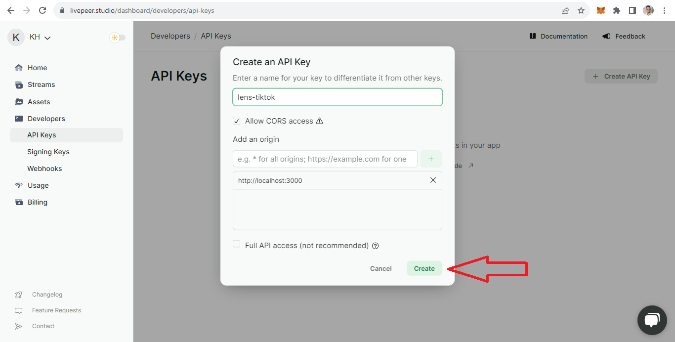 بعد ذلك، انقر فوق "Create an API Key"، وقم بإعطاء اسم لمفتاحك ثم انسخه حيث سنحتاج إليه لاحقًا.
