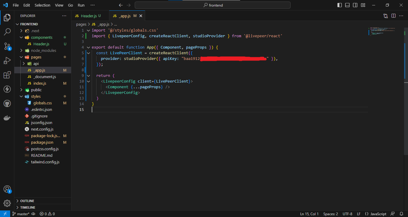 مكتبة Livepeer.js عبارة عن JavaScript SDK مع خطافات جاهزة للاستخدام تتيح لنا تحميل الفيديو بسرعة وتقديم مقاطع الفيديو والاتصال بـ Livepeer Studio. إذهب إلى الملف app.js_ في المجلد pages وقم بإعداد بهذا الشكل: