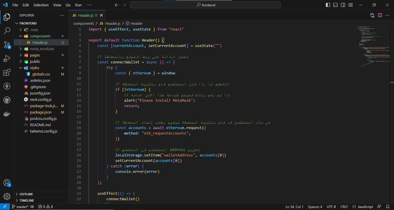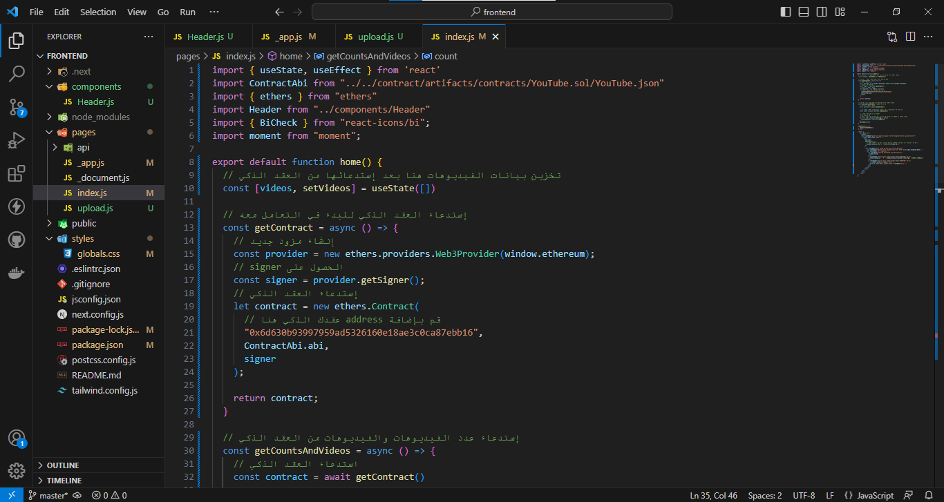 - في المجلد frontend سنقوم ببناء الواجهة الامامية للمشروع وربطها بالعقد الذكي.
