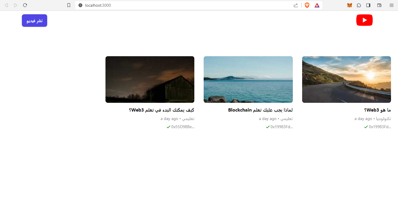 احفظ الملف و قم بتجربته من هنا - localhost:3000 - لقد انتهينا من صفحة إستدعاء الفيديوهات من عقدك الذكي. يجب أن تكون الآن قادرًاعلى رؤية الفيديوهات التي قمت بنشرها على العقد الذكي الخاص بك.
