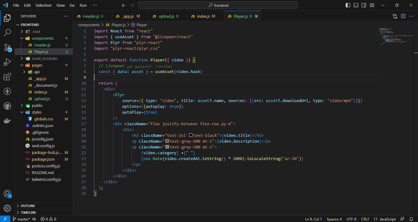 من اجل تشغيل الفيديوهات اثناء النقر عليها في صفحة video. سنقوم اولا بالعمل على واجهة المشغل من خلال الذهاب إلى المجلد components وإنشاء ملف Player.js وإضافة هذا الكود هناك