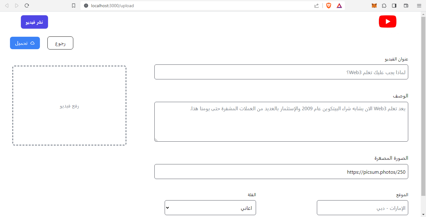 احفظ الملف و قم بتجربته من هنا - localhost:3000/upload - لقد انتهينا من صفحة نشر الفيديو. يجب أن تكون الآن قادرًا على تحميل مقاطع الفيديو إلى العقد الذكي.