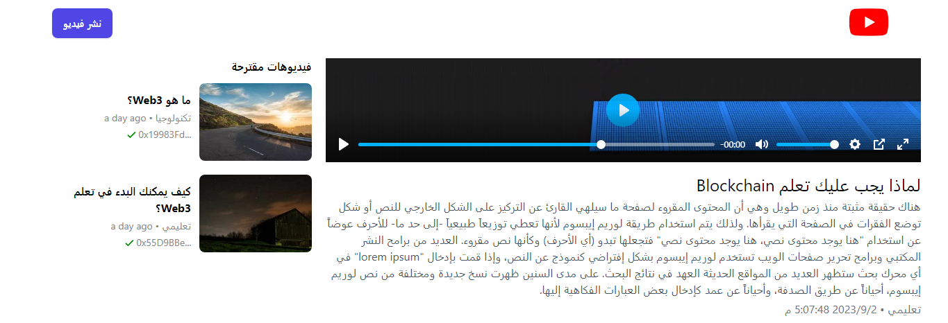 أفضل طريقة لتحسين مهاراتك في Web3 هي استخدامها في إنشاء مشاريع مختلفة والإجابة على الاسئلة التي ربما تجول في عقلك مثل كيف يمكننا التعامل مع الفيديوهات في مشاريع Web3 بطريقة لا مركزية مثل YouTube. في هذا الدرس ستقوم بإنشاء مشروع بسيط مماثل لفكرة YouTube ولكن لامركزي بشكل كامل إعتماداً على المهارات السابقة في الدروس التي في الاعلى بالإضافة الى Livepeer والذي سيساعدك في التعامل مع الفيديوهات التي سيقوم بنشرها المستخدمين.