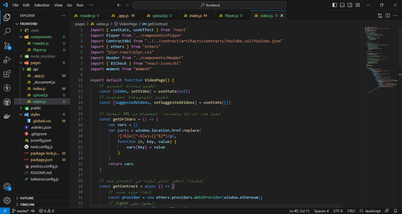 ستذهب إلى المجلد pages من أجل إنشاء الملف video.js والذي سيقوم بعرض الفيديوهات من العقد الذكي وتشغليها. قم بإضافة هذا الكود هناك