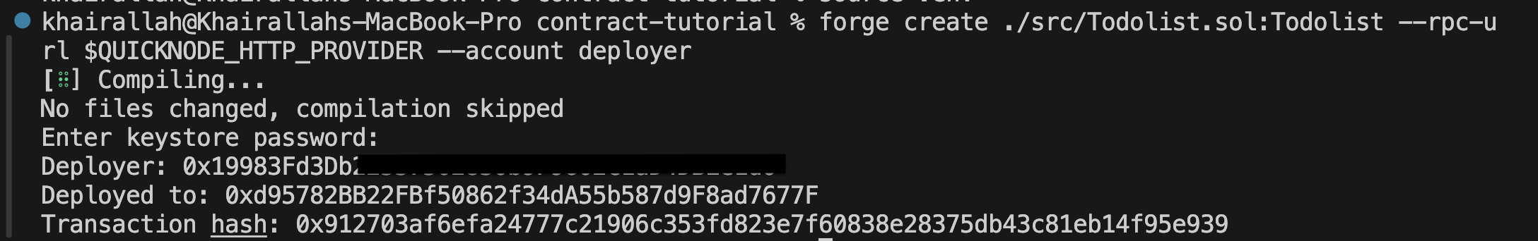 forge create ./src/Todolist.sol:Todolist --rpc-url $QUICKNODE_HTTP_PROVIDER --account deployer