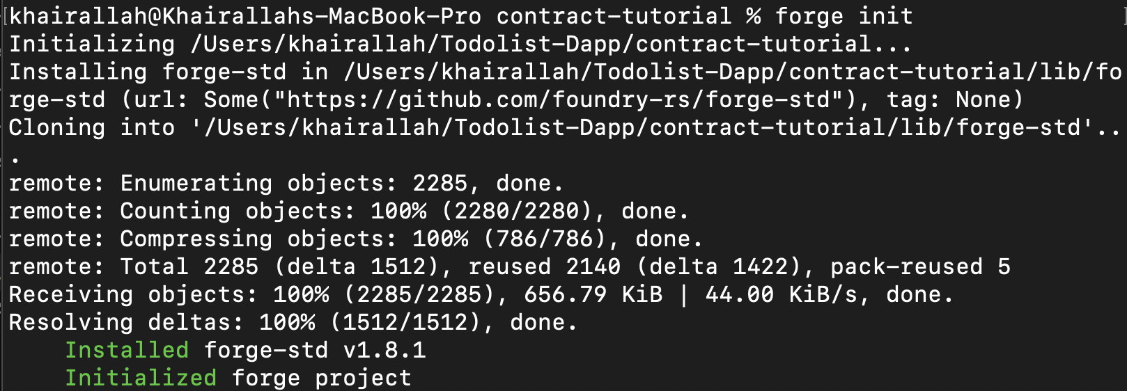سنقوم بفتح المجلد contract-tutorial على terminal ونقوم بإنشاء مشروع Foundry بواسطة هذا الأمر: