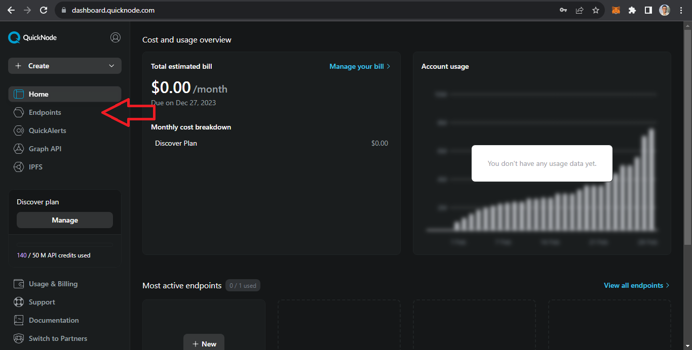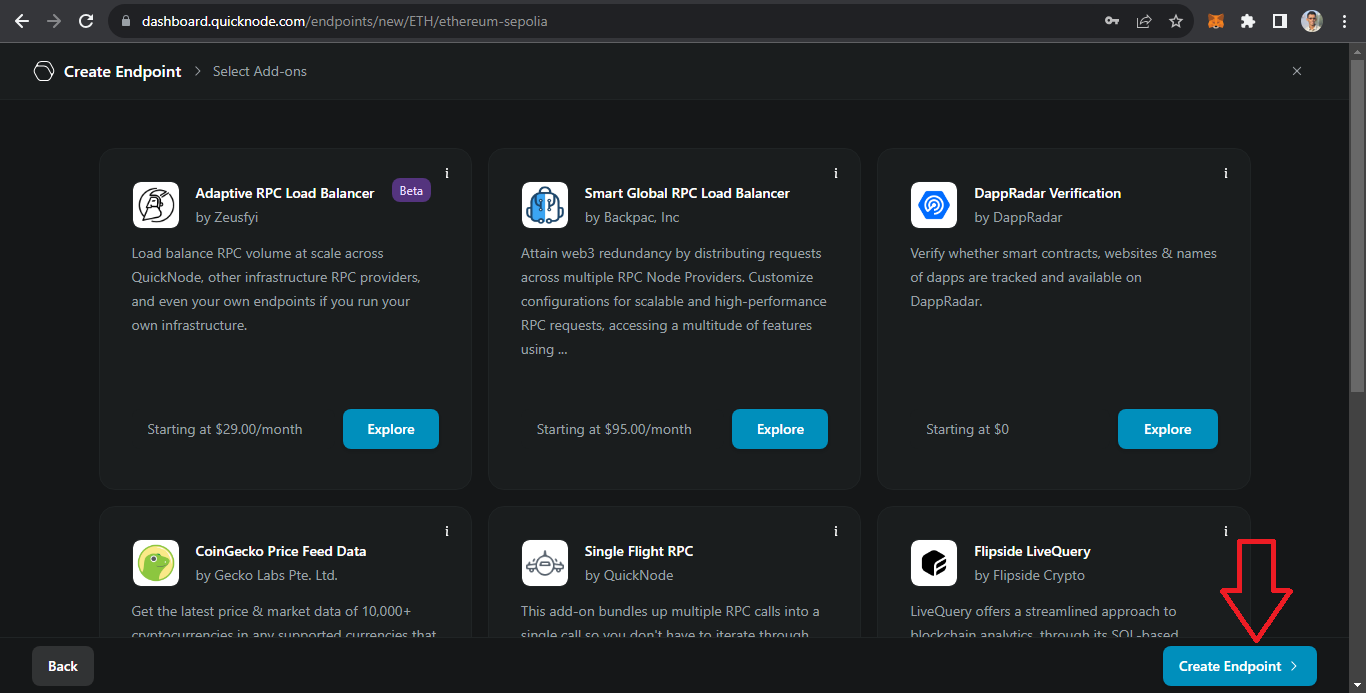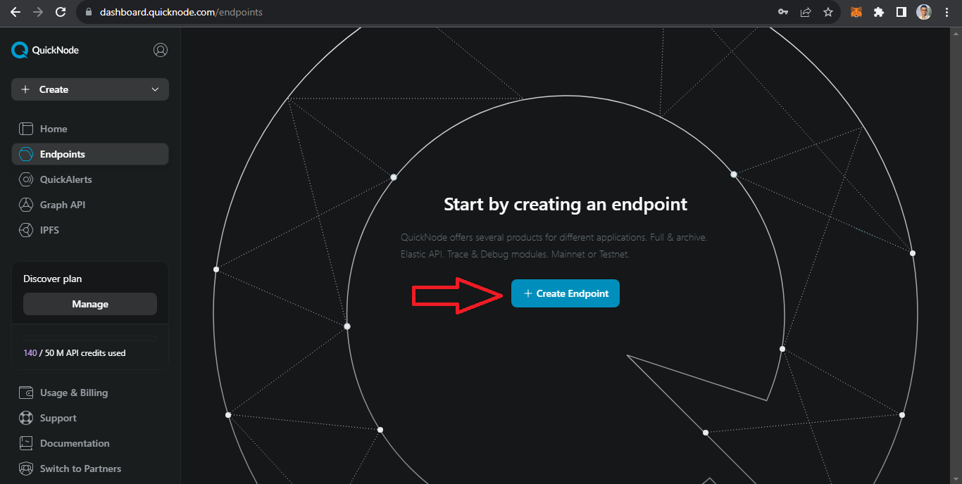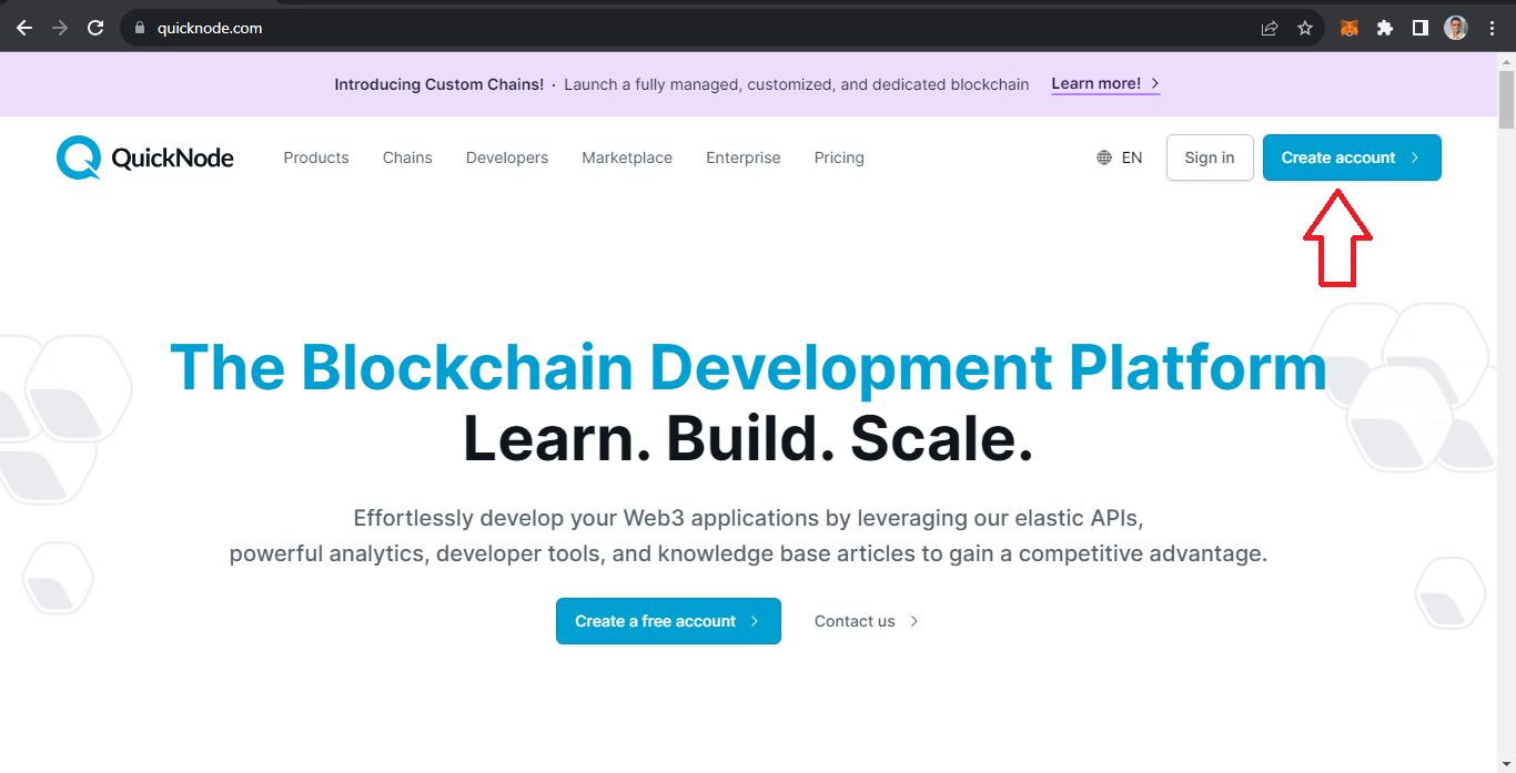 الان ستحتاج الى مزود عقدة يتيح لك الاتصال بالعديد من سلاسل الكتل المختلفة. يمكنك استخدام QuickNode كمزود للعقد الخاصة بك بكل سهولة.