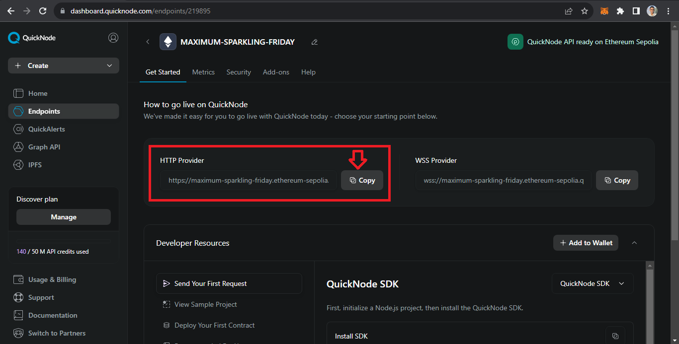 4- أخيراً - ستقوم بنسخ HTTP Provider لأننا سنحتاجه لاحقاً من اجل نشر عقدنا الذكي على شبكة Sepolia