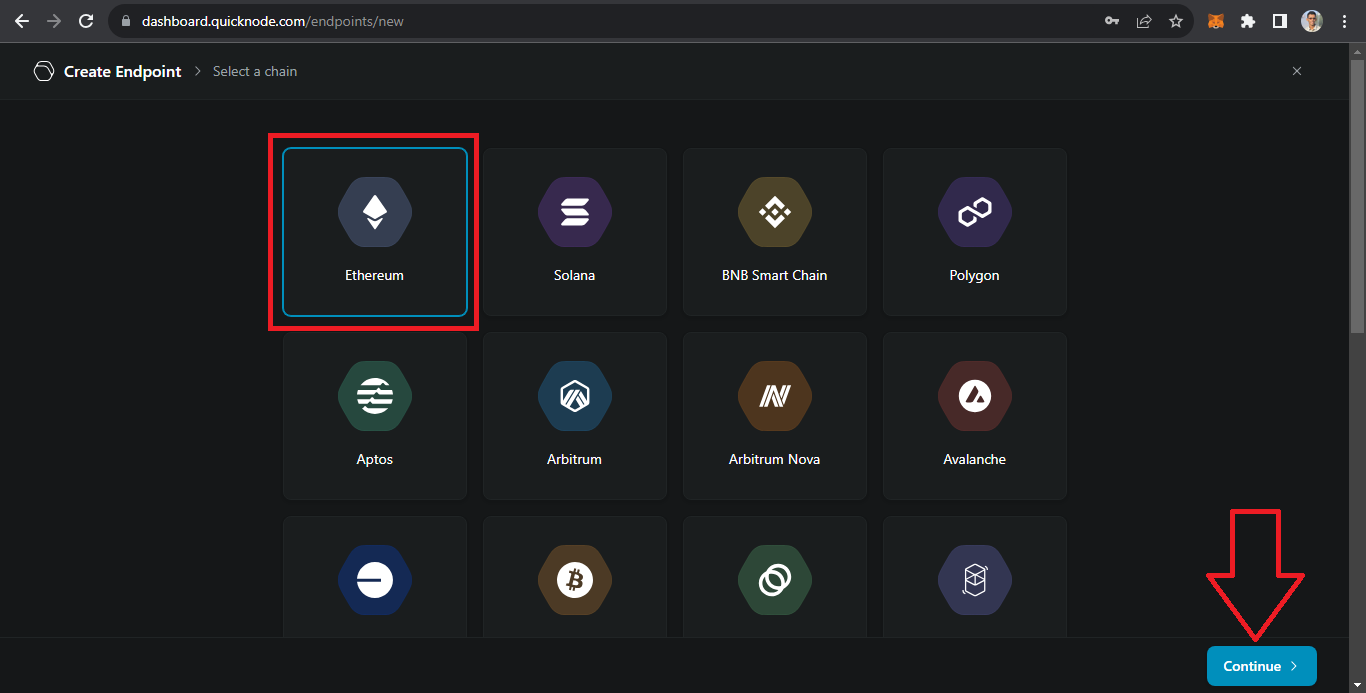 1- سنقوم بإستخدام سلسلة Ethereum فلذلك سنقوم بتحديدها هكذا والنقر على الزر Continue: