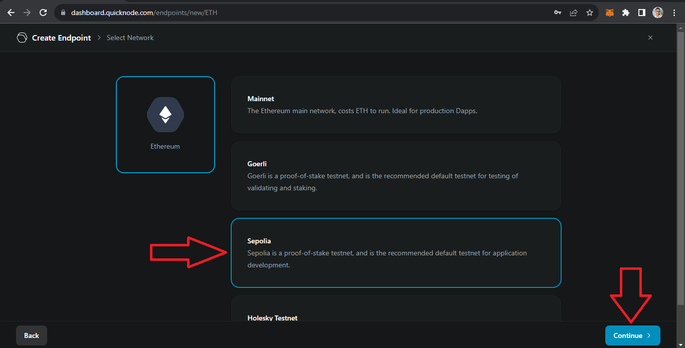 2- بما ان الغرض من الدرس هو التعلم فلذلك سنقوم بتحديد شبكة الإختبار Sepolia والنقر على الزر Continue: